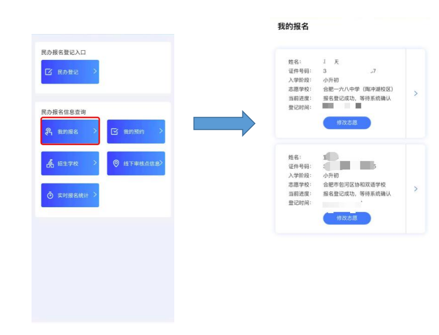 (二)我的报名进入报名系统首页,选择报名区域,点击“民办报名登记” ->“我的报名”,可查看本人为适龄儿童少年登记报名的信息详情。