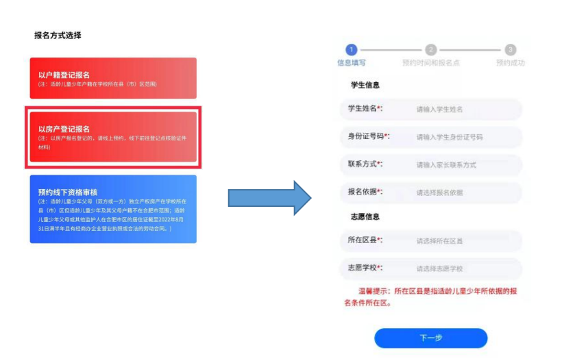 2.以房产登记报名点击“以房产登记报名”,预约线下审核材料,填写相关信息,并确保信息真实有效(注:预约成功后不可修改或取消预约)。其中“志愿学校”仅为意愿的学校,最终以线下审核结果为准,选择报名点时,建议根据房产所属的县区选择报名点就近进行线下材料核验。