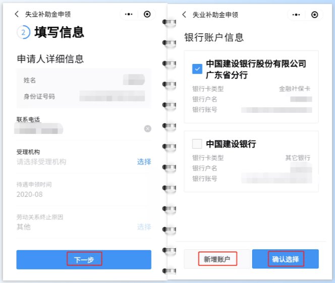 ⑤进入填写信息页面,系统通过数据比对自动获取联系电话、劳动关系终止原因、银行账户等信息,手动选择“受理机构”,点击“下一步”,进入填写银行账户信息页面,选择或新增账户,点击“确认选择”。