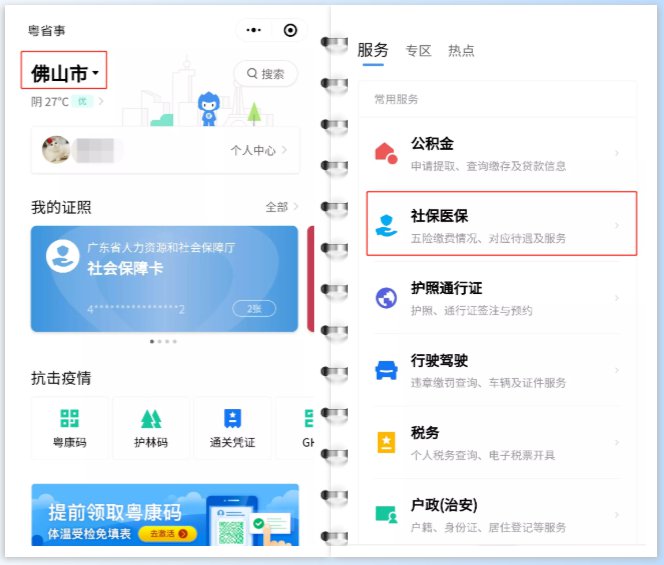 ①微信搜索“粤省事”小程序,进入小程序首页左上角切换城市为佛山市,下滑选择“社保医保”服务板块(如未关联社保卡可按照页面提示关联社保卡)。