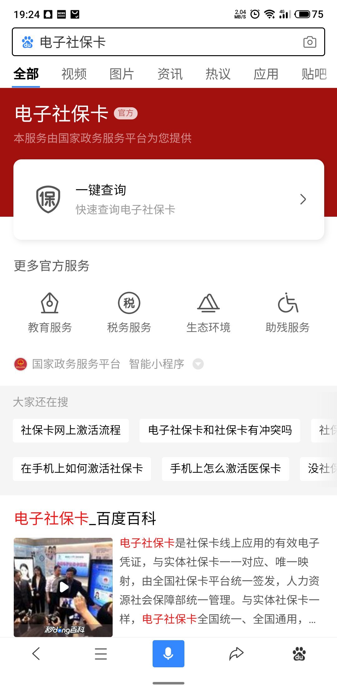 第一步:进入百度APP,搜索『电子社保卡』,点击进入