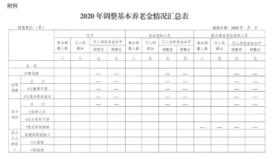 调整增加的基本养老金发放到位后,各市要及时汇总数据,认真总结分析本市调整情况形成书面报告,并填写《2020年调整退休人员基本养老金情况汇总表》,于2020年8月10日前报送省人力资源社会保障厅、省财政厅,抄送省社保局。