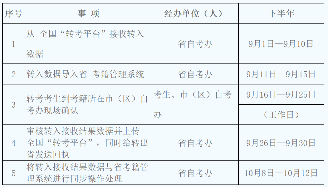1.转入考生应及时关注转出省考生服务平台本人转考信息,转出成功后,在规定日期内,到我省考籍所在市(区)自考办办理转入确认手续。