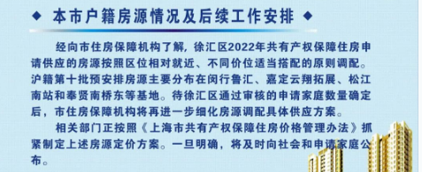 据市住房保障机构消息,徐汇区2022年共有产权保障住房申请供应的房源按照区位相对就近、不同价位适当搭配的原則调配。我区非沪籍第四批预安排房源主要分布在嘉定云翔拓展和奉贤南桥东等基地。待徐汇区通过审核的申请家庭数量确定后,再进一步细化房源调配具体供应方案。