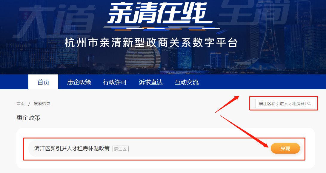 点击进入>>>杭州“亲清在线”平台,登录后搜索“滨江区新引进人才租房补贴”,点击“兑现”,后续根据网页提示操作。