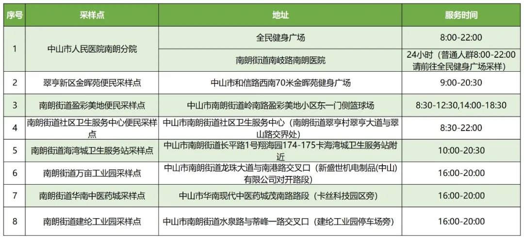 3月28日起,翠亨新区(南朗街道)8个便民核酸采样点继续对外开放,具体信息如下: