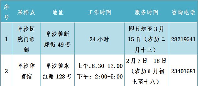 注:阜沙医院支持各类型核酸检测;阜沙体育馆核酸检测包括自费核酸检测和省外来(返)中山(阜沙)人员免费核酸检测。
