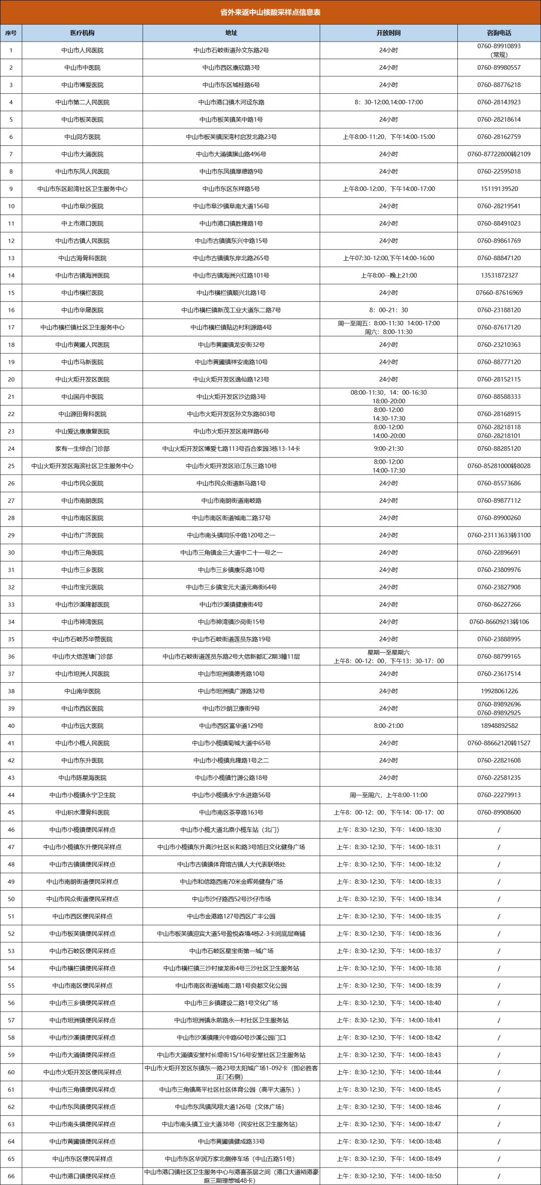 为进一步强化常态化疫情防控工作,排查省外输入风险,使省外来返中山人员获得就近就便核酸检测服务,即日起,我市面向省外来返中山人员提供一次免费核酸检测服务。现将省外来返中山核酸采样点服务信息公布如下: