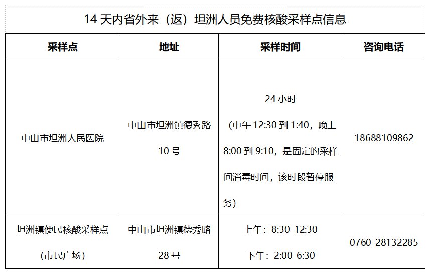 目前坦洲镇有以下两个核酸采样点,面向14天内省外来(返)坦洲人员,提供一次免费核酸检测服务