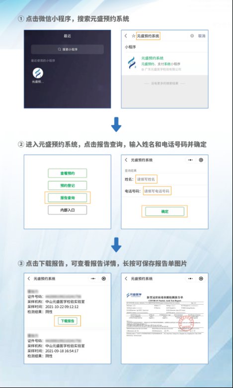受检者可在采样12小时后,在“粤康码”或者“元盛预约系统”小程序查询。