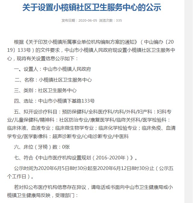 中山市小榄镇人民政府2020-06-05发布《关于设置小榄镇社区卫生服务中心的公示》