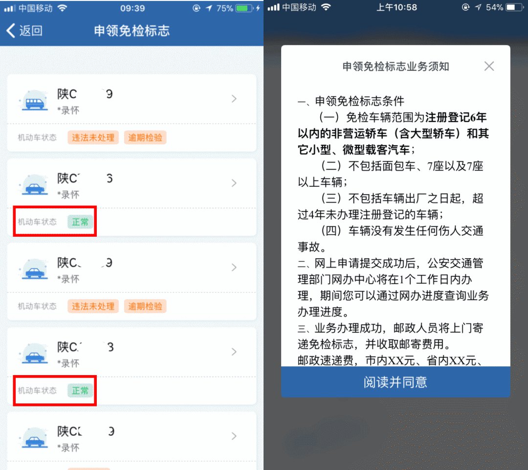 用户选择需免检车申领检验标志的机动车。认真阅读免检车申领检验标志业务须知后,点击【阅读并同意】进入车辆信息确认页面。对于交强险和车船税联网核查是否通过的,分别进入两个不同的业务操作流程。