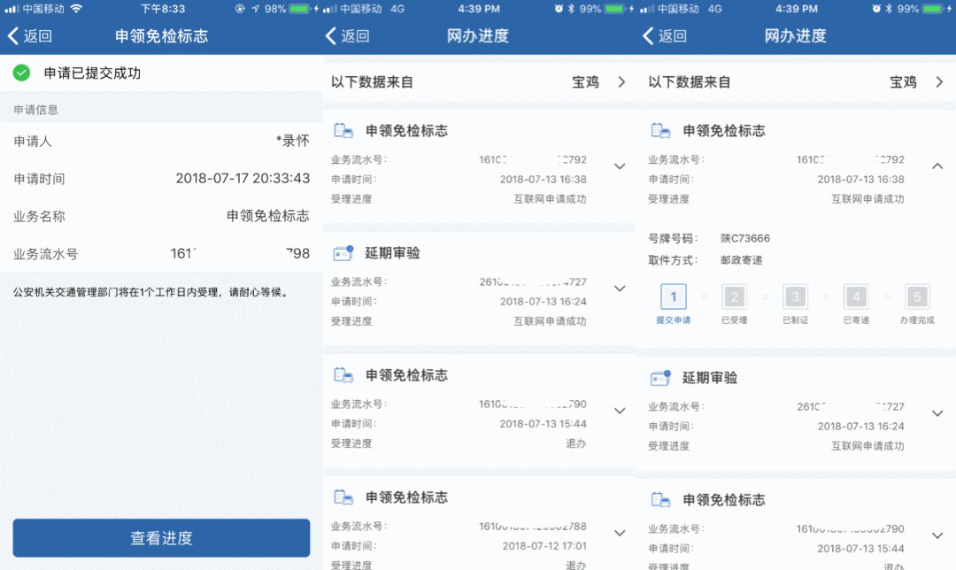 提交成功后,用户可通过【首页】→【网办进度】功能随时查看业务办理进度,车管所工作人员将在1个工作日内完成业务受理。