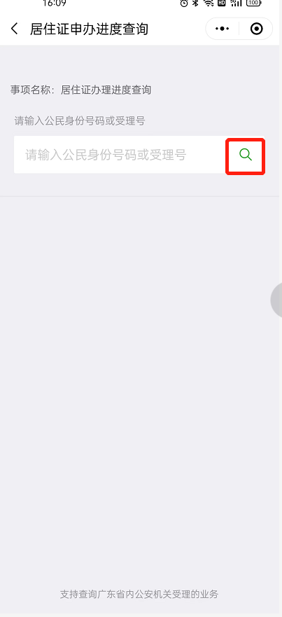 4、输入身份证号码或受理号,点击旁边的放大镜即可查询办理进度。
