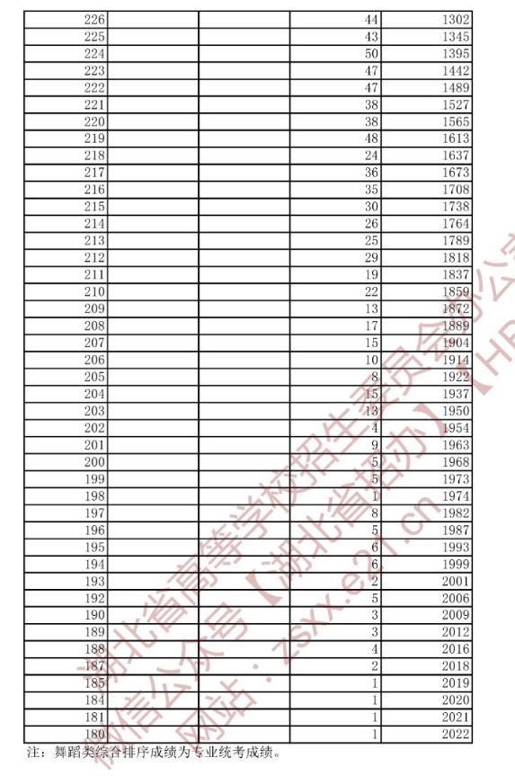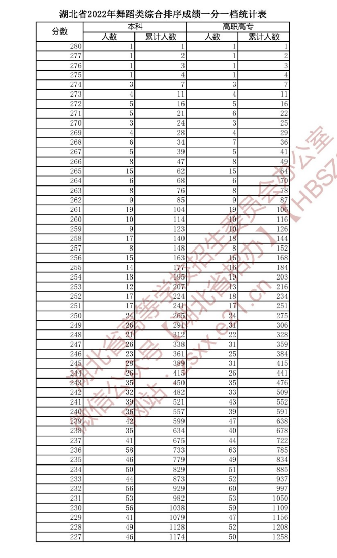湖北省高考2022年舞蹈类综合排序成绩一分一段统计表