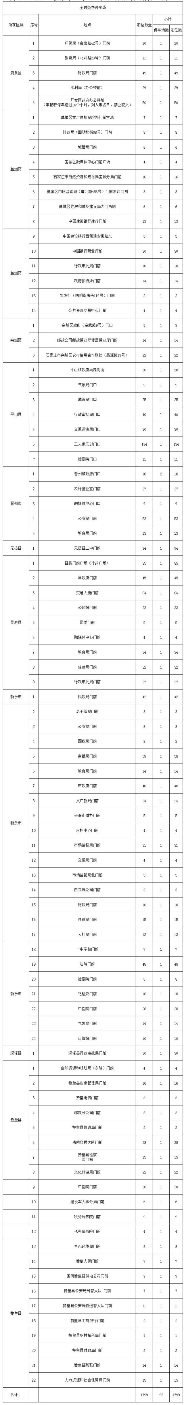近期,石家庄各县(市、区)政府认真摸排核查辖区机关、事业单位所属门前广场、空地设置的停车场,对具备错时共享、对外开放的实行免费停车。截至8月17日,10个县(市、区)共核查汇总92个停车场、1799个泊位可实行免费停车(连续停放最长不得超过24小时)。