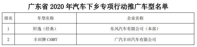 广东省汽车流通协会推荐了60个2020年广东省“汽车下乡”活动推广车型。
