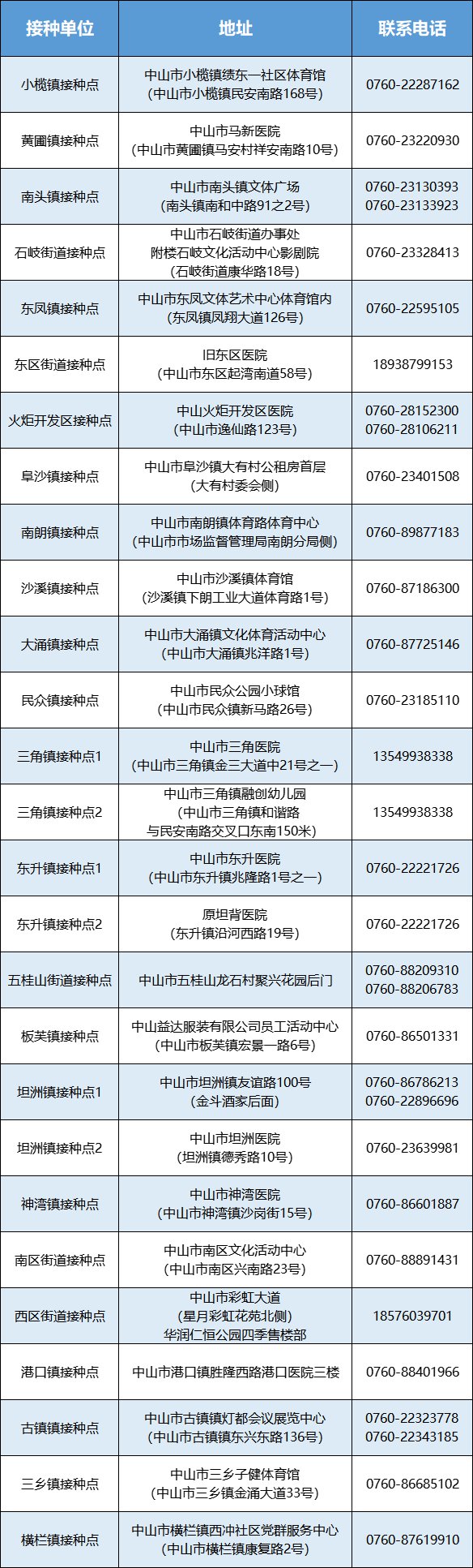 中山市第一批27个大型新冠病毒疫苗接种点