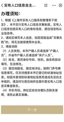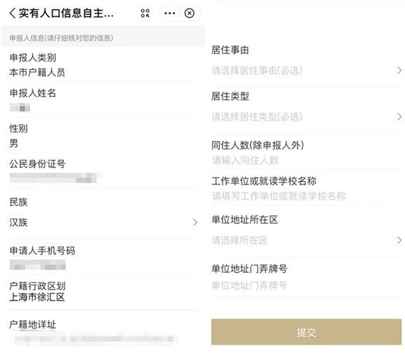 申报人在完成阅读申报须知并通过二次人脸识别的本人验证后,进入申报页面进行实有人口信息网上自主申报。申报人须填写真实有效的居住地路名、门弄号牌以及具体的户号室号等必填居住信息,选择居住事由和居住类型,填写同住人数及工作单位信息。