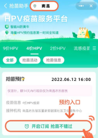 本次活动因疫情防控需要,仅限行程码近14天显示只有南昌的居民可预约,有外市行程显示的本次均不可预约(以接种日当天计算14天内),不符合要求者请勿预约,有14天中高风险地区旅居史请勿预约,适龄且身体条件符合的女性可预约,本次预约包含三针(需一次性缴3针的费用)。以下为预约和接种的详细信息,请务必认真阅读!