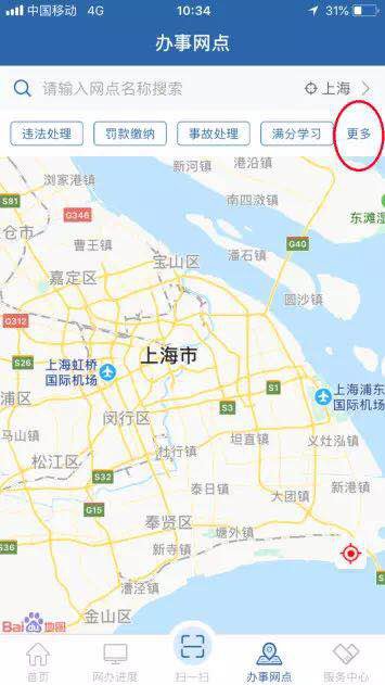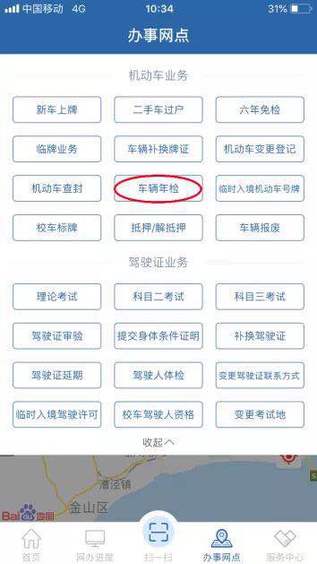 登录“交管12123”手机APP,点击右下角“办事网点”,选择“更多”中的“车辆年检”版块