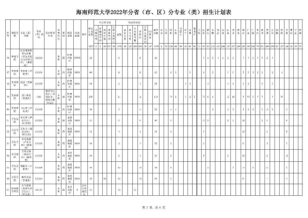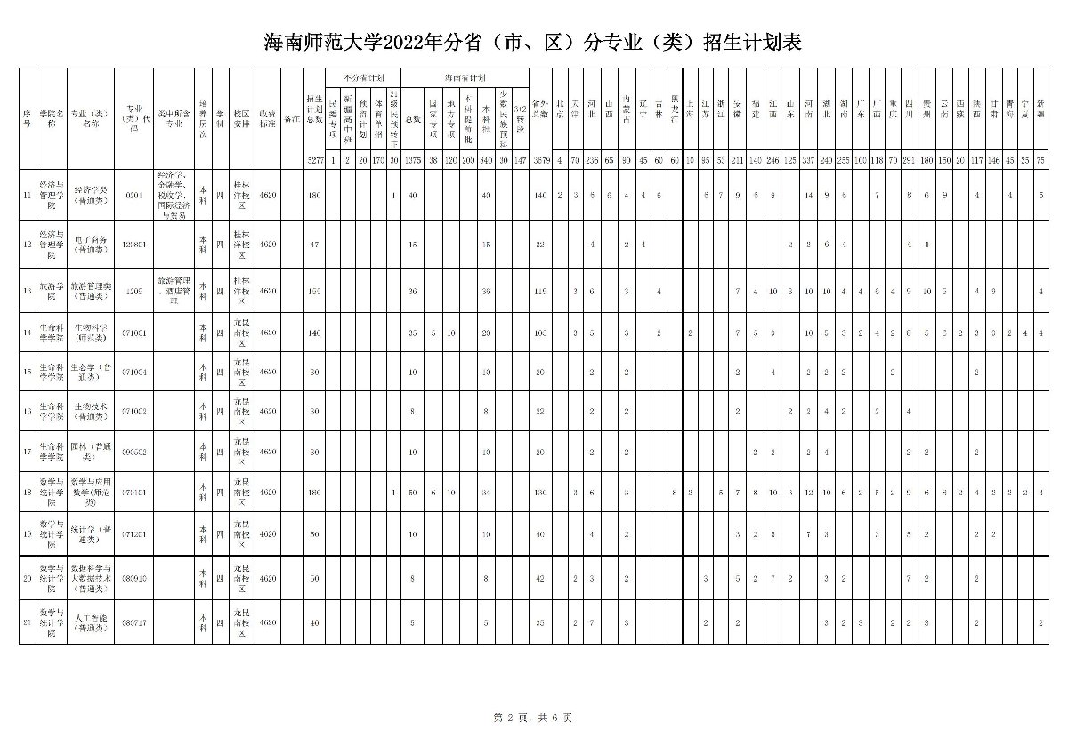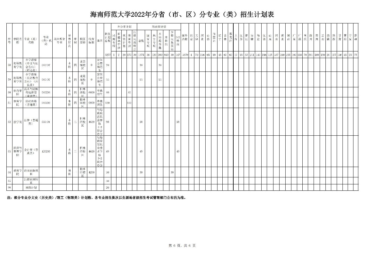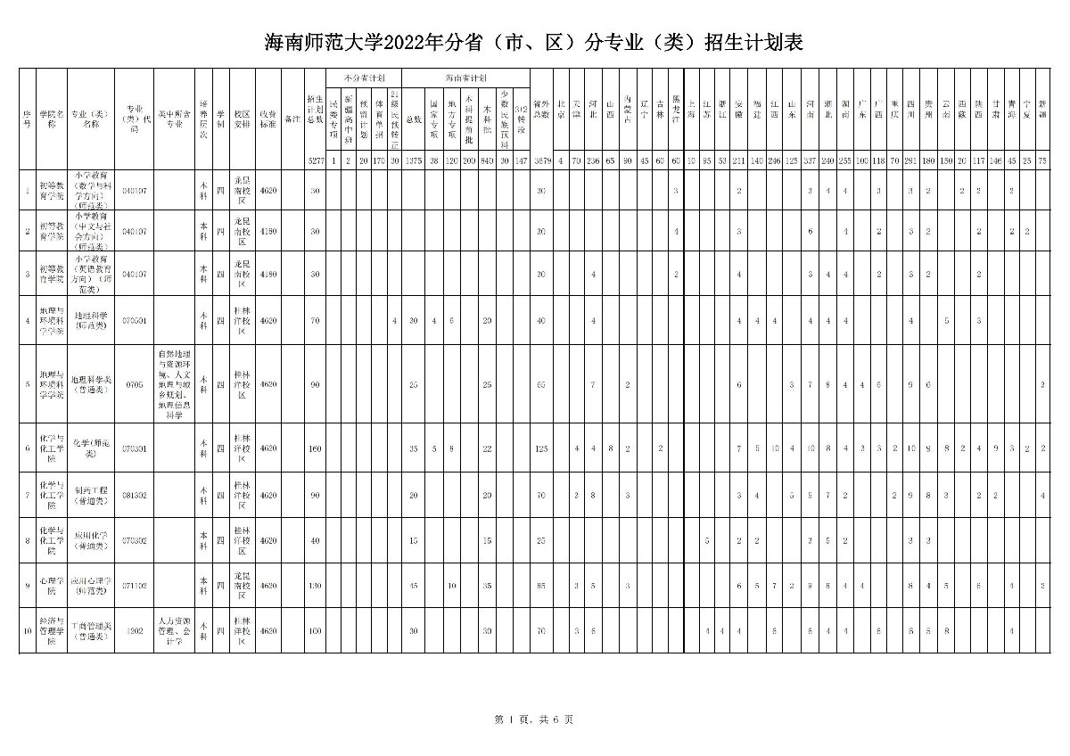 海南师范大学2022年分省(市、区)分专业(类)招生计划表