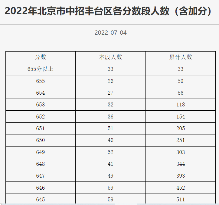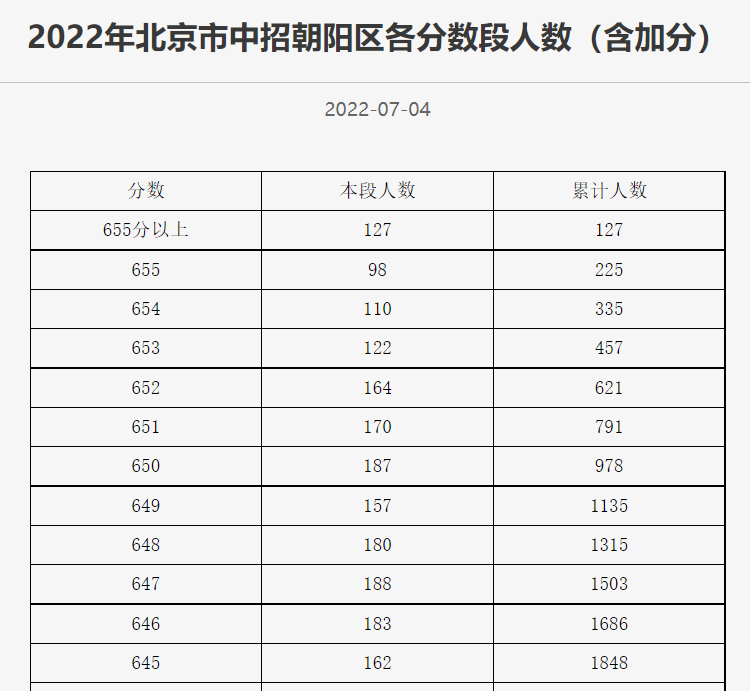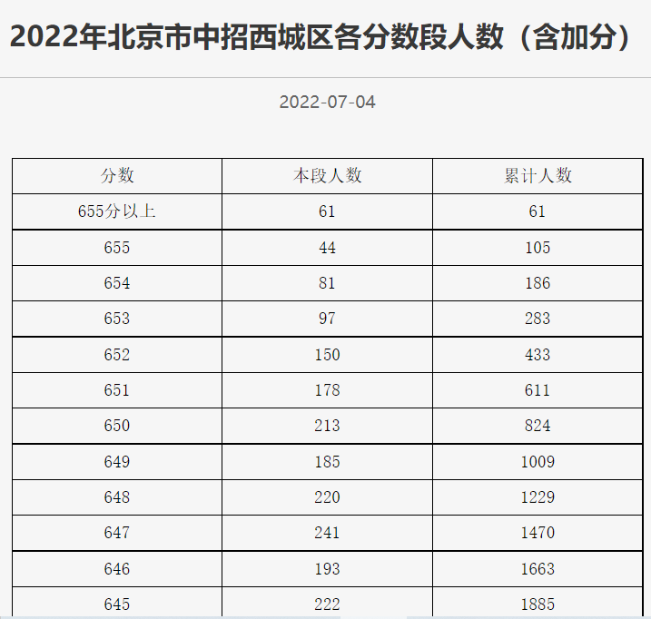 2022年7月5日,2022年北京市中招各区分数段人数统计出炉。今年655分以上(含加分)学生中,海淀区最多,为517人,其次为朝阳区127人。此外,西城区61人,东城区55人,丰台区33人,石景山区12人。