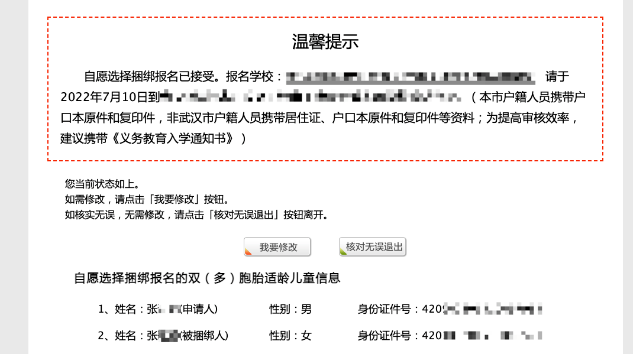 点击“我要修改”按钮,将解除所有多(双)胞胎的捆绑关系,并清除所有捆绑多(双)胞胎的报名意愿。多(双)胞胎学生解除捆绑后可各自进行报名,也可根据上述步骤重新捆绑报名。