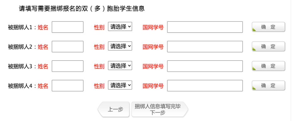 上一步骤勾选“是”,点击“下一步”后,请按系统提示填写需要捆绑报名的双(多)胞胎学生信息,只需要填写被捆绑人的姓名、性别、身份证件号(小学)或国网学号(初中),点击“确定”按钮,完成双胞胎捆绑。如果是多胞胎,继续填写下一个被捆绑学生信息,并点击“确定”按钮,直至所有需要捆绑的多胞胎学生都捆绑完成。若信息填写有误,系统将提示无法完成捆绑。