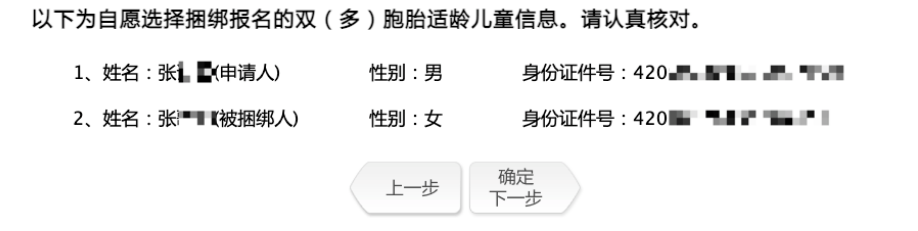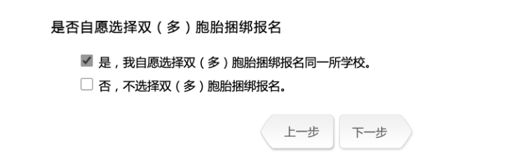 上一步骤勾选“同意”的,点击“下一步”后,系统将提示:“是否自愿选择双(多)胞胎捆绑报名”,在选项中进行勾选,点击“下一步”,勾选“是”将继续进行双(多)胞胎捆绑报名,勾选“否”将返回普通报名。