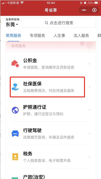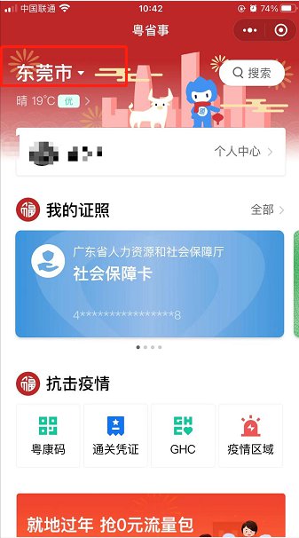 登陆手机微信粤省事小程序个人账号后,定位在东莞市
