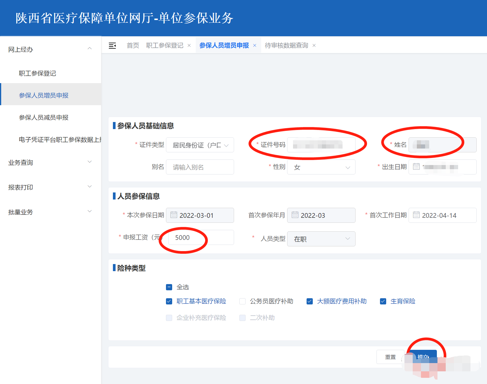 参保人员增员申报:点击进入单位网厅,选择左侧菜单参保人员增员申报,输入员工身份证号码,一般会自动出现该人员的基本信息,输入申报工资(如实按员工真实工资填报,切勿自行按最低基数填报,不按真实工资申报医保基数是违法行为!),医保系统将根据申报工资自动核定缴费基数,每年医保年审时方可再次按照上年度月均工资重新修改申报缴费工资基数。参保日期和停保日期,一般都按系统默认的时间,不要擅自修改。确认无误后点击提交即可。