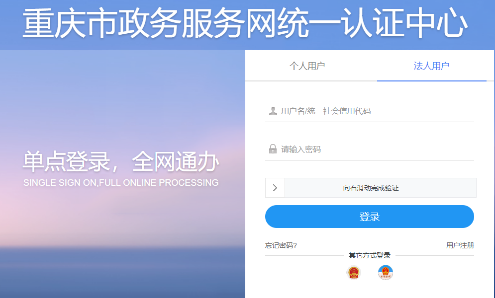 重庆人社网办大厅登录采用的“重庆市政务服务网统一认证中心”,若在渝快办、市政府等政务网有注册过账号,可使用该账号直接进行登录;若未进行注册则需要先注册账号实名认证后才能登录系统进行事项申报操作。