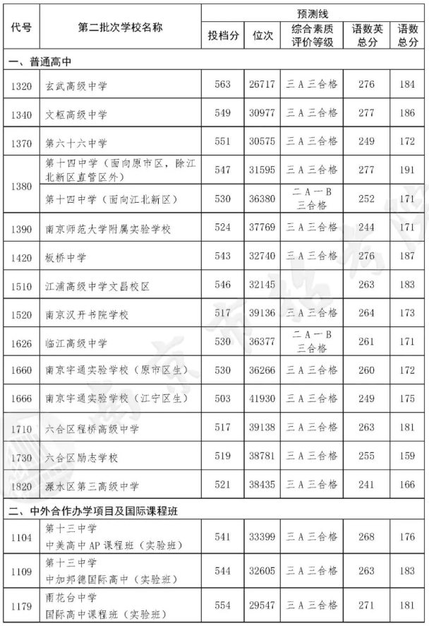 说明:根据《南京市2022年高中阶段学校考试招生工作意见》规定,投档分相同时,需按排序规则录取。投档分相同考生排序规则为:首先根据综合素质评价等级排序依次投档;若综合素质评价等级排序仍然相同,则根据语文、数学、英语三门学科总分,从高分到低分排序依次投档;若语文、数学、英语三门学科总分仍然相同,则根据语文、数学两门学科总分,从高分到低分排序依次投档。