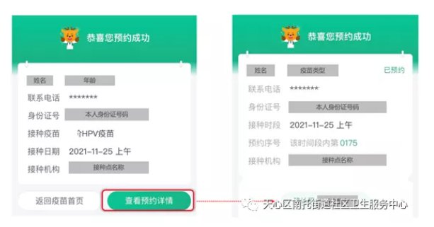 预约成功后,点击“查看预约详情”,将获得确认码,收到预约短信后,,请携带身份证,按预约时间准时前往接种点接种。