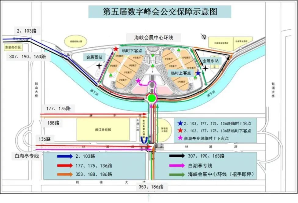 白湖亭区间专线:则徐大道—后坂路—林浦路—潘墩路—展城环岛—会展中心1.2号馆门口(下车点)