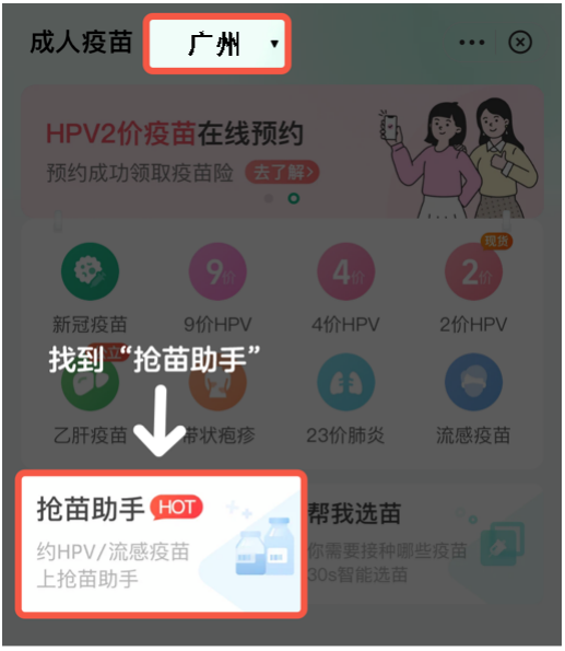 第二步:选择“广州”地区,点击医鹿APP首页 “成人疫苗” ,进入页面后再点击“抢苗助手”。