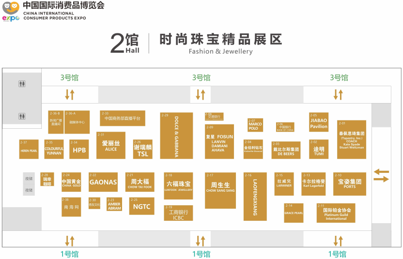 2号馆共有26家企业,46个品牌参展,展览面积约5000平方米,该展馆内有戴比尔斯集团、DAMIANI、DJULA等,香港重点珠宝品牌包括周大福、谢瑞麟、周生生、六福珠宝等。