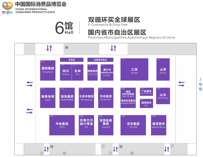 6号馆展览面积共计13230平方米,集合了以中免集团为代表的免税零售企业,以京东集团为代表的跨境电商企业,以及以国药集团为代表的医药健康企业,共计16家展商,品牌数402个。