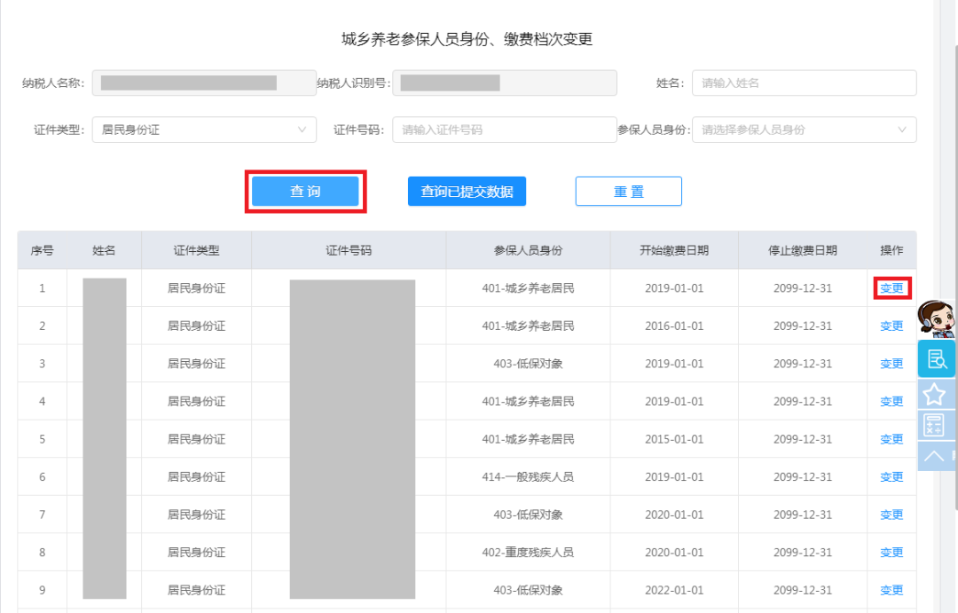 ①输入需要变更的人员【证件类型】、【证件号码】等查询条件,点击查询,寻找需要变更的人员,点击【变更】;