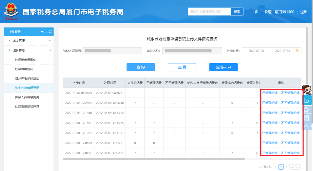③点击【查看已上传文件处理情况】查询文件处理结果,点击【已受理明细】、【不予受理明细】可查看详细处理意见。