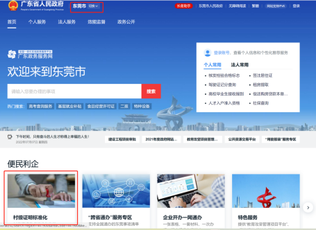 2.在广东政务服务网东莞专区的便民利企栏目,点击“村级证明标准化专区”,选择具体业务,点击在线办理。