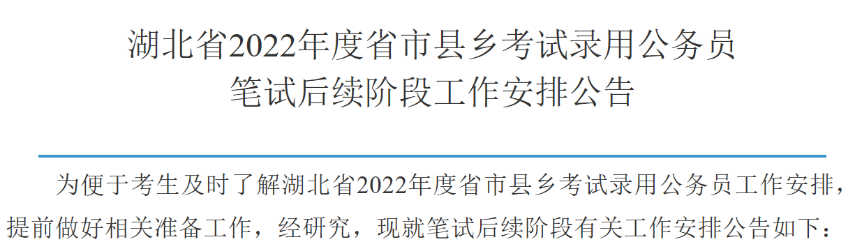 湖北省公务员局《湖北省2022年度省市县乡考试录用公务员笔试后续阶段工作安排公告》中发布了面试安排: