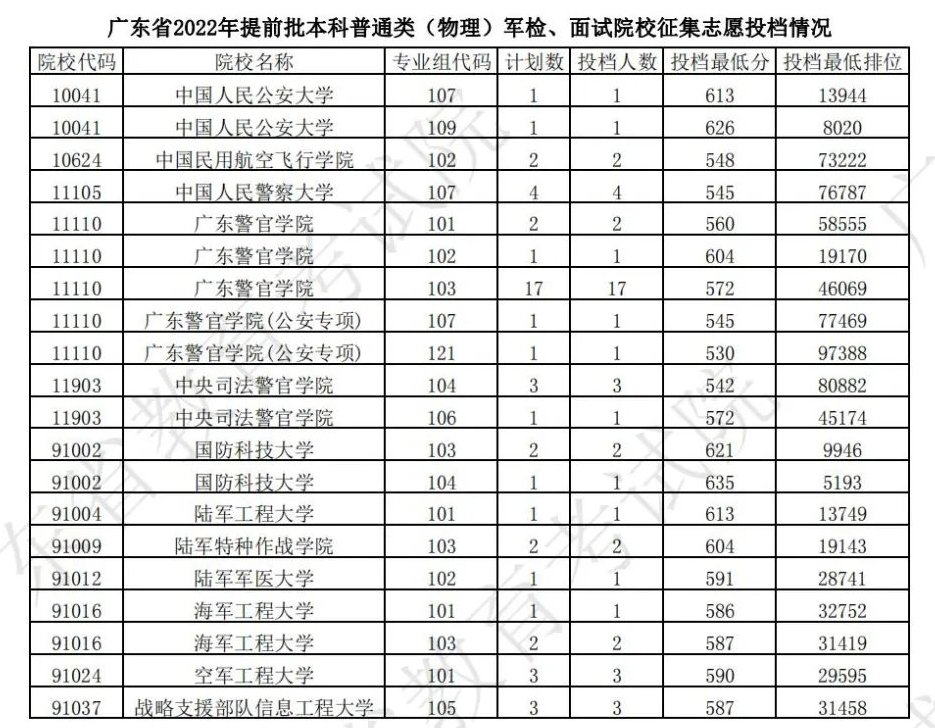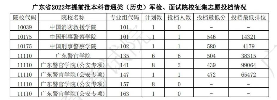 2.公安院校。高考成绩达到广东省2022年普通高校招生本科院校录取最低分数线[普通类(历史):总分437分;普通类(物理):总分445分],政治考察、体检、面试和体能测评合格且未被录取的考生。