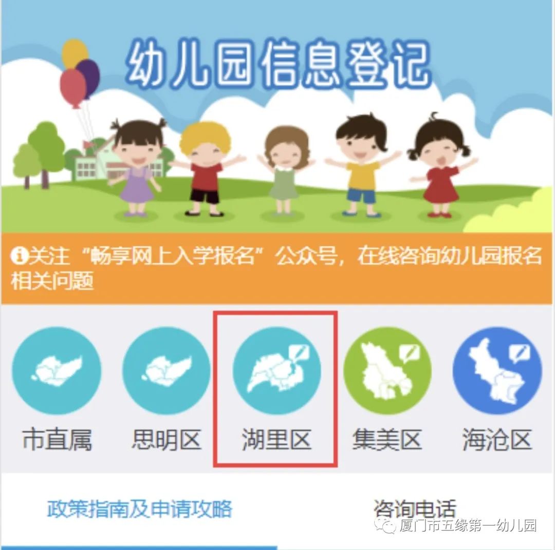 手机微信关注“厦门i教育”微信公众号(微信号:xm_ijy)→公安实名注册“i教育账号”并登录→点击左下角的“热门应用”→“入学一件事”→“幼儿园报名”→“我要报名”,选择“湖里区”→输入孩子姓名及身份证号→经系统校验,符合片区招生条件的,填写孩子信息、父母信息和房产信息→勾选“诚信保证”→提交登记信息完成登记,待系统审核数据。(注:可通过“i教育”-“我的”-“账户安全”查看自己的账号信息)