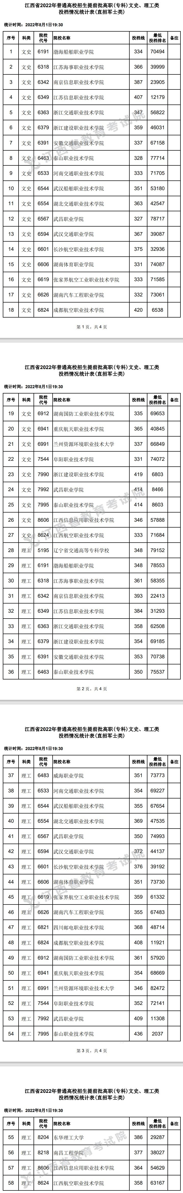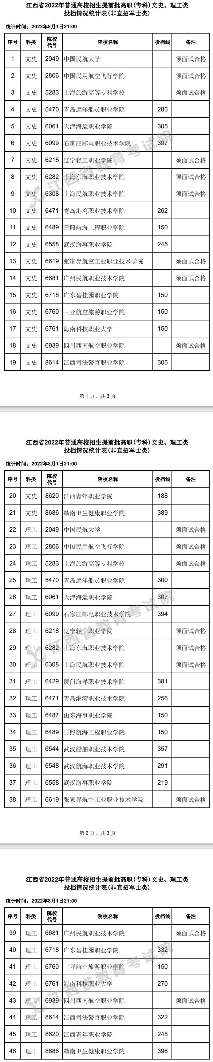 ➤江西省2022年普通高校招生提前批高职(专科)文史、理工类投档情况统计表: