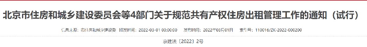 为满足共有产权住房购房人实际生活需求,规范住房租赁活动,提高住房使用效率,根据《北京市共有产权住房管理暂行办法》(京建法〔2017〕16号)、《关于加快发展和规范管理本市住房租赁市场的通知》(京建法〔2017〕21号)等文件规定,经市政府同意,现就规范本市共有产权住房出租管理有关工作通知如下: