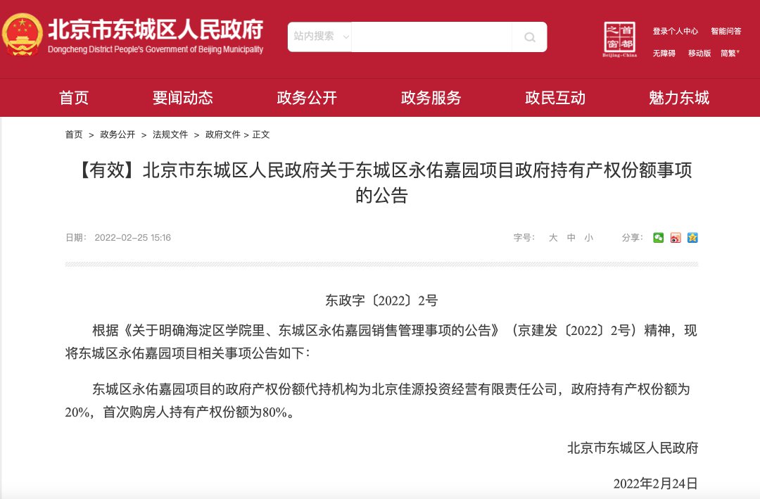 2月25日,东城区政府发布《关于东城区永佑嘉园项目政府持有产权份额事项的公告》,明确东城区“新型共有产权房”永佑嘉园项目的政府产权份额代持机构为北京佳源投资经营有限责任公司,政府持有产权份额为20%,首次购房人持有产权份额为80%。