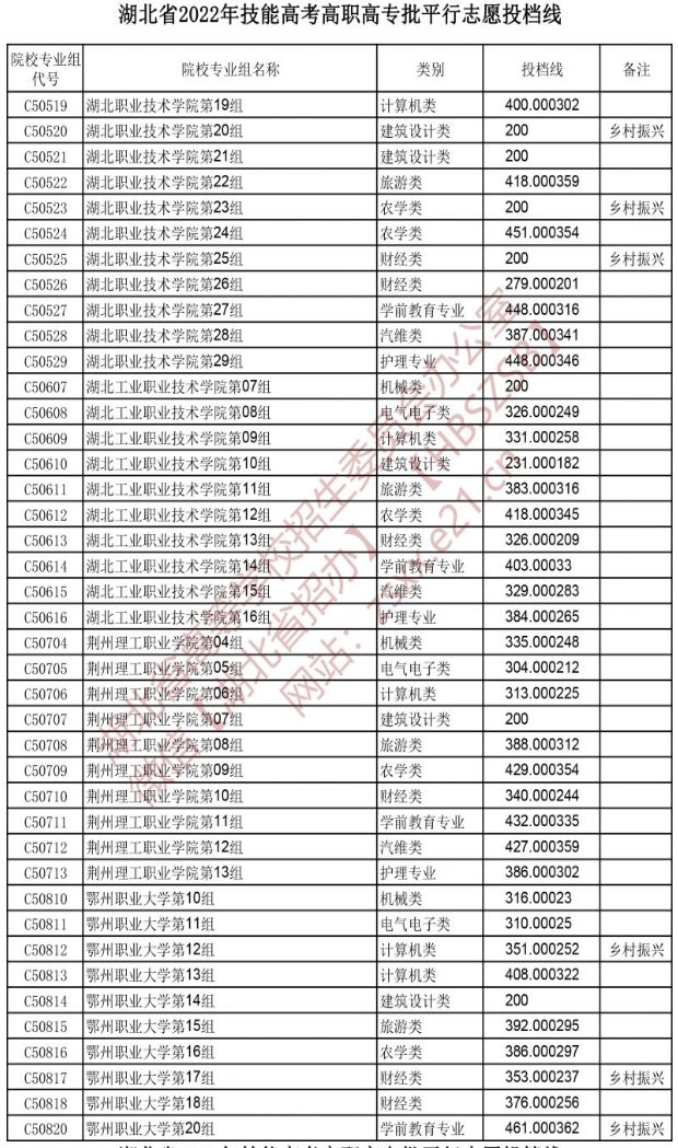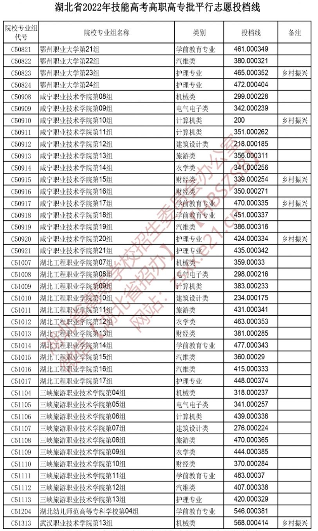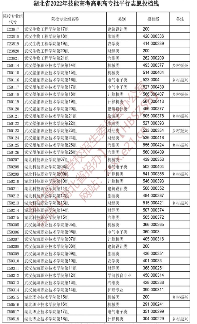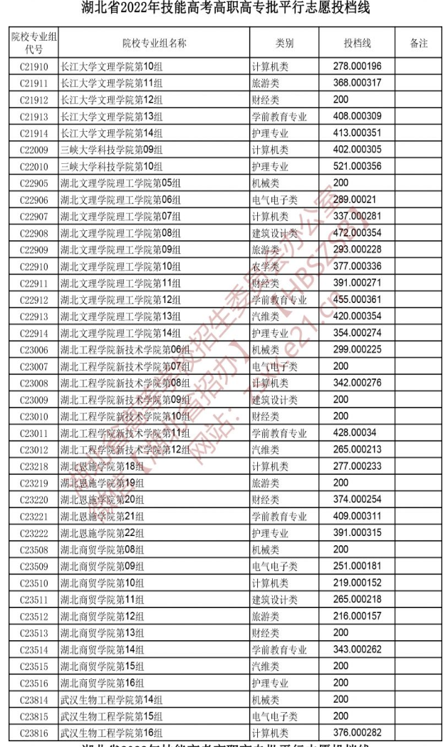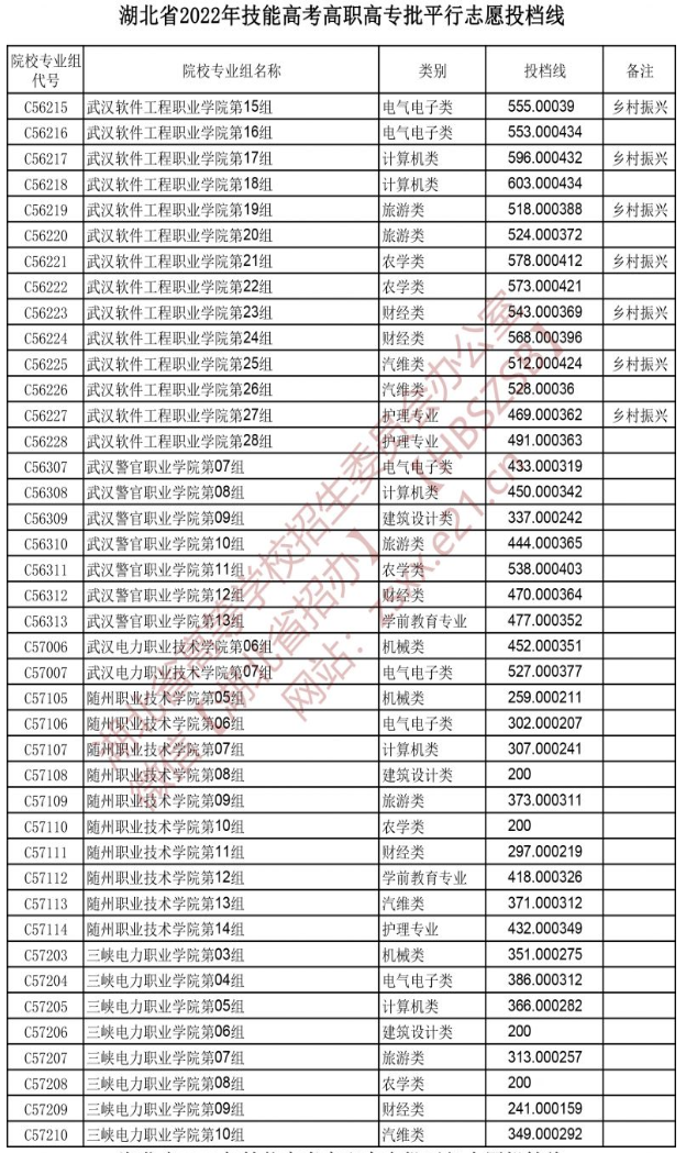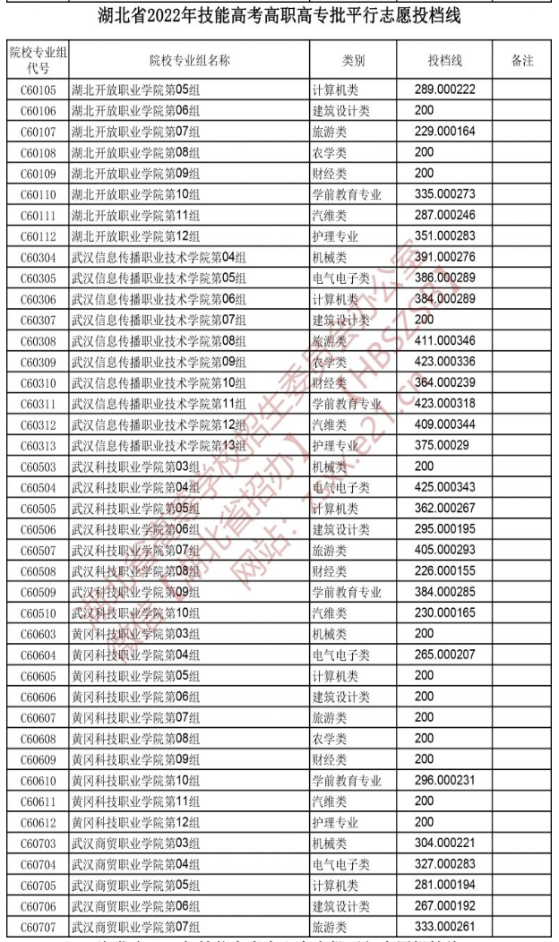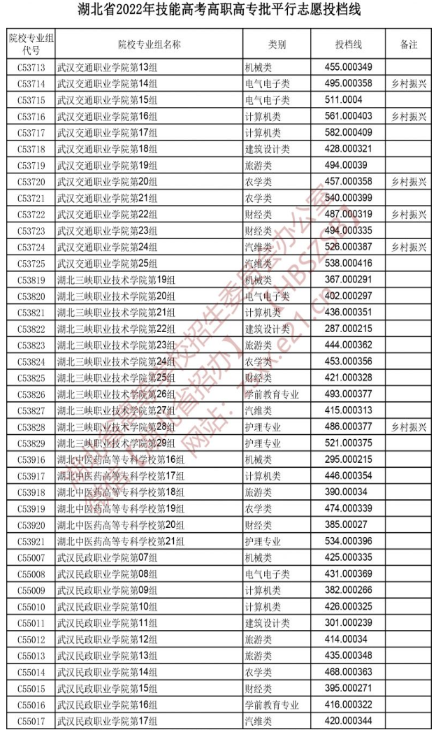 湖北省2022年技能高考高职高专批平行志愿投档线