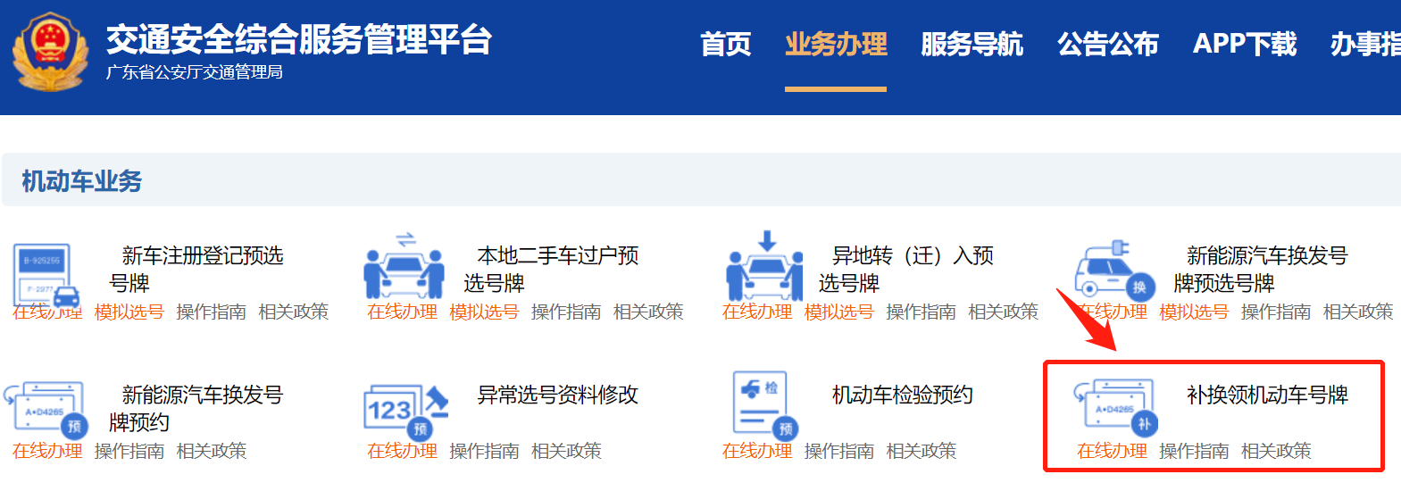 第一步:点击上方链接进入交通安全综合服务管理平台,注册/登录用户信息,点击【业务办理】,选择【补换领机动车号牌】进入补换领机动车号牌业务流程;
